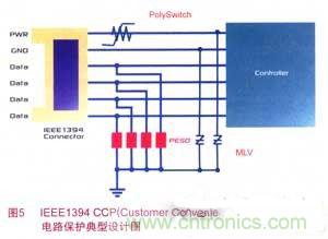 隨著USB/IEEE1394通信速率的增加,電路日趨小型化和敏感化,對電路瞬態(tài)的保護就顯得更為重要。每當(dāng)連接和斷開PND,電路都會受到瞬態(tài)過電壓/過電流的沖擊,故需要在電源和地上分別抑制瞬間過壓。由于鉗位而不會引起供電中斷,且價格較低,MLV常被采用。為滿足USB和IEEE1394接口規(guī)范要求,PolySwitch器件通常用于防止USB電源線上因過電流造成的設(shè)備損壞,是即插即用型應(yīng)用設(shè)備的理想選擇。
