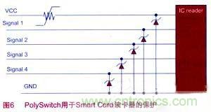 接觸式Smart Card內(nèi)部有一個IC芯片,用于傳輸信息、存儲數(shù)據(jù)等。Smart Card工作時,由讀卡器的Vcc電壓供電。損壞的Smart Card或者其他導(dǎo)電物品被錯誤地放進讀卡器,都有可能造成讀卡器電路出現(xiàn)短路,而造成永久損壞。在讀卡器電路中使用PolySwitch可恢復(fù)器件能夠?qū)Υ祟愲娐饭收线M行保護。如圖6,在讀卡器的Vcc供電電路中串聯(lián)PolySwitch器件,當(dāng)出現(xiàn)短路過電流故障時,PolySwitch器件能夠切斷電路,在故障排除后恢復(fù)電路,并在所有端口進行ESD防護。