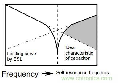 MLCC有經(jīng)典的V型阻抗-頻率曲線。隨著頻率升高,寄生電感的影響開始凸顯,阻抗先變小再變大,這是MLCC的固有特性。曲線中的最低點就是MLCC的自諧振頻率。