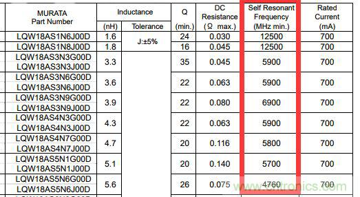 C0G/NP0類的低損耗電容和高Q值RF繞線電感datasheet中一般都會主動標出自諧振頻率的具體值和測試方法。簡單地說,電容在低于自諧振頻率的區(qū)間內(nèi)才有作為容性元件的利用價值,電感在自諧振頻率內(nèi)才有作為電感的利用價值。