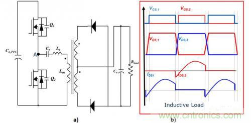 圖a)是典型的LLC串聯(lián)諧振電路。圖b)是感性負載下MOSFET的工作波形。由于感性負載下,電流相位上會超前電壓,因此保證了MOSFET運行的ZVS。要保證MOSFET運行在感性區(qū),諧振電感上的諧振電流必須足夠大,以確保MOSFET源漏間等效的寄生電容上存儲的電荷可以在死區(qū)時間內(nèi)被完全釋放干凈。