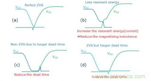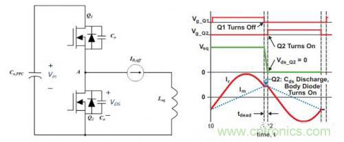 因此選擇合適的MOSFET(足夠小的等效寄生電容),對于ZVS的實現(xiàn)至關重要,尤其是當Vds接近于0的時候,等效輸出電容要足夠小,這樣還可以進一步降低死區(qū)時間并提高LLC的工作效率。