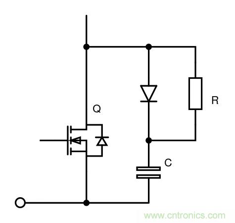 在開關(guān)緩沖電路中,電容器與電阻/二極管組合串聯(lián),并通過電源開關(guān)(通常為IGBT或MOSFET)連接,以控制dV/dt,如圖2所示。