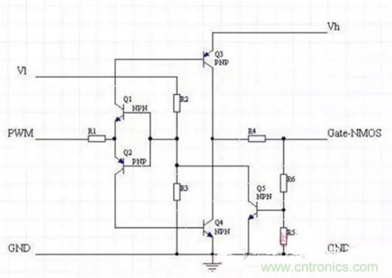 當(dāng)使用5V電源,這時(shí)候如果使用傳統(tǒng)的圖騰柱結(jié)構(gòu),由于三極管的be有0.7V左右的壓降,導(dǎo)致實(shí)際最終加在gate上的電壓只有4.3V。這時(shí)候,我們選用標(biāo)稱gate電壓4.5V的MOS管就存在一定的風(fēng)險(xiǎn)。