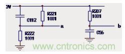 如下圖6所示電路中,測量a點(diǎn)電壓正常值應(yīng)為R221、R22對3V供電的分壓值1.5V,若測量電壓值高于1.5V,可能系電容C112漏電損壞所致;測b點(diǎn)電壓正常值應(yīng)為3V,若低于3V,可能系電容C56漏電損壞所致。
