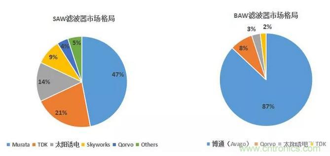 從全球范圍來看,SAW濾波器的主要供應商包括TDK-EPCOS、Murata(村田)和太陽誘電,三者合計占據(jù)了全球82%的市場份額。BAW濾波器的主要供應商包括Avago及Qorvo(Triquint),兩者占據(jù)了全球95%以上的市場份額。