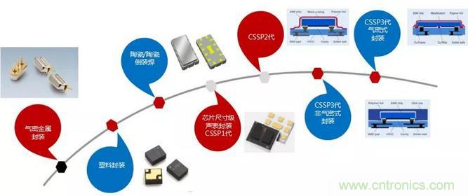 SAW器件封裝要求:(1)器件有源表面必須有一定空間;(2)襯底和封裝材料必須有良好的熱匹配;(3)防止?jié)駳饨撕臀⒘U次邸O群蠼?jīng)歷過氣密金屬封裝、塑料封裝、陶瓷封裝、陶瓷倒裝焊、芯片尺寸級聲表封裝CSSP等幾個階段,針對不同的客戶需求和應用場景這些封裝方案依然共存,但是器件的小型化是大勢所趨。