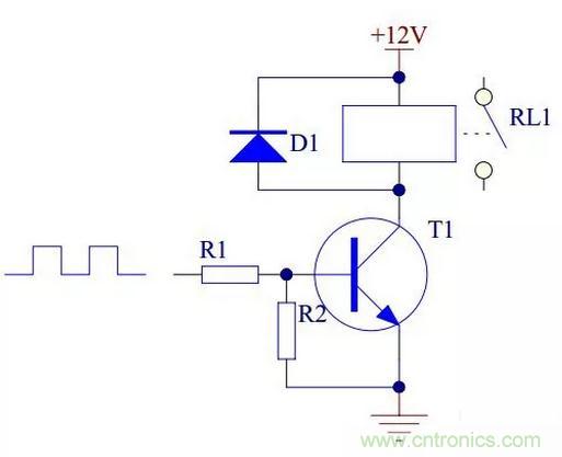 電路中各元器件的作用:晶體管T1為控制開關(guān);電阻R1主要起限流作用,降低晶體管T1功耗;電阻R2使晶體管T1可靠截止;二極管D1反向續(xù)流,為三極管由導通轉(zhuǎn)向關(guān)斷時為繼電器線圈中的提供泄放通路,并將其電壓箝位在+12V上。