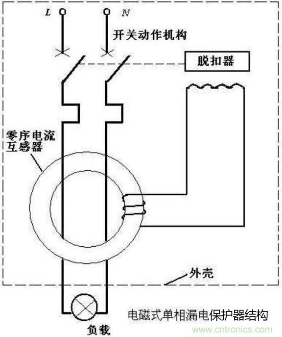 像我們家中的漏電保護器的原理圖就如上圖一般,漏電保護器就是一種電流形繼電器,當電流大于設(shè)定值的時候是開關(guān)跳閘。