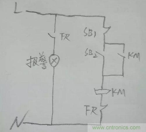 簡單描述一下這個圖。當電動機工作正常的時候,熱繼電器的常閉觸點接通,常開觸點斷開,報警裝置不工作。如果電機出現(xiàn)故障,熱繼電器內(nèi)部的熱元件把常閉點斷開的同時,熱繼電器的常開點閉合,報警裝置形成回路,報警響起,提醒操作人員及時檢修。
