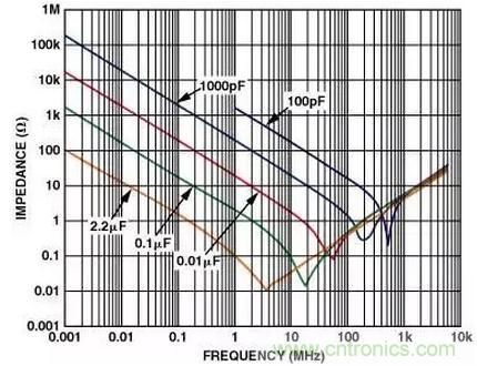 并聯(lián)不同的電容值的電容器有助于確保電源引腳在很寬的頻帶上只能看到很低的交流(AC)阻抗。這對于在運算放大器電源抑制比(PSR)衰減頻率處尤其重要。該電容器有助于補償放大器降低的PSR。在許多十倍頻程范圍內保持低阻抗的接地通路將有助于確保有害的噪聲不能進入運算放大器。圖1示出了采用多個并聯(lián)電容器的優(yōu)點。在低頻段,大的電容器提供低阻抗的接地通路。但是一旦頻率達到了它們自身的諧振頻率,電容器的容性就會減弱,并且逐漸呈現(xiàn)出感性。這就是為什么采用多個電容器是很重要的原因:當一個電容器的頻率響應開始下降時,另一個電容器的頻率響應開始其作用,所以能在許多十倍頻程范圍內保持很低的AC阻抗。