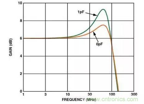 在高速電路中,很小的值就會影響電路的性能。有時候幾十個皮法(pF)的電容就足夠了。相關實例:如果在反相輸入端僅有1 pF的附加寄生電容,它在頻率域可以引起差不多2 dB的尖脈沖(見圖4)。如果寄生電容足夠大的話,它會引起電路的不穩(wěn)定和振蕩。
