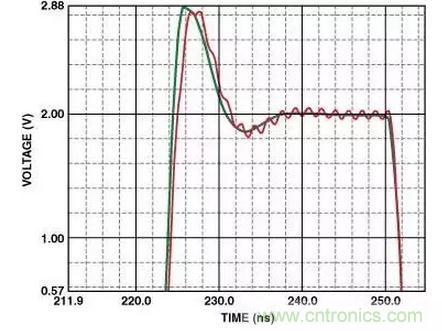 圖7中的振蕩示出了高速運算放大器同相輸入端長度為2.54 cm的印制線的影響。其等效寄生電感為29 nH(10-9H),足以造成持續(xù)的低壓振蕩,會持續(xù)到整個瞬態(tài)響應周期。圖7還示出了如何利用接地平面來減小寄生電感的影響。