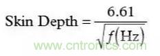 在高頻段,必須考慮一種稱為“趨膚效應”的現(xiàn)象。趨膚效應會引起電流流向導線的外表面——結果會使得導線的橫截面變窄,因此使直流(DC)電阻增大。雖然趨膚效應超出了本文討論的范圍,這里還是給出銅線中趨膚深度(Skin Depth)的一個很好的近似公式(以cm為單位):