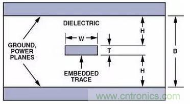 (6)H表示從接地平面到信號印制線之間的距離,W表示印制線寬度,T表示印制線厚度;全部尺寸均以密耳(mils)(10-3英寸)為單位。εr表示PCB材料的介電常數(shù)。