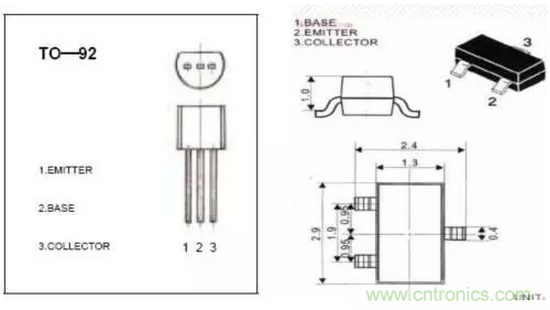 ※三極管引腳極性:插件引腳圖示(1),貼件引腳圖示(2)下圖為9014。般中小功率的三極管都是遵守左向右依次為ebc(條件是中小功率塑料三極管按圖使其平面朝向自己,三個引腳朝下放置,則從左到右依次為ebc)