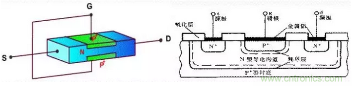 ※場效應(yīng)分類:場效應(yīng)管主要有結(jié)型場效應(yīng)管(JFET)和絕緣柵型場效應(yīng)管(IGFET)。絕緣柵型場效應(yīng)管的襯底(B)與源析(S)連在一起,它的三個極分別為柵極(G)、漏極(D)和源極(S)。晶體管分NPN和PNP管,它的三個極分別為基極(b)、集電極(c)、發(fā)射極(e)。場效應(yīng)管的G、D、S極與晶體管的b、c、e極有相似的功能。絕緣柵型效應(yīng)管和結(jié)型場效應(yīng)管的區(qū)別在于它們的導(dǎo)電機構(gòu)和電流控制原理根本不同,結(jié)型管是利用耗盡區(qū)的寬度變化來改變導(dǎo)電溝道的寬窄以便控制漏極電流,絕緣柵型場效應(yīng)管則是用半導(dǎo)體表面的電場效應(yīng)、電感應(yīng)電荷的多少去改變導(dǎo)電溝道來控制電流。它們性質(zhì)的差異使結(jié)型場效應(yīng)管往往運用在功放輸入級(前級),絕緣柵型場效應(yīng)管則用在功放末級(輸出級)。場效應(yīng)管的工作原理和三極管其本一樣,只是他們一個是壓控型元件,一個是電流控制元件,場效應(yīng)管只有一個PN結(jié),如圖所示1-1