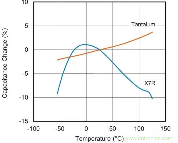 用于替換最可能的MLCC候選者采用“II類”電介質(zhì)材料。這種II類陶瓷(通常為X7R或X5R)的容值會(huì)在溫度范圍內(nèi)變化,這種特征稱為電容溫度系數(shù)(TCC),參見(jiàn)圖1。
