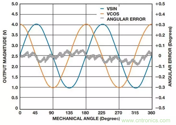 以Analog Devices公司的ADA4571 系列為例,圖2顯示了旋轉(zhuǎn)磁場施加在360° 機(jī)械旋轉(zhuǎn)情形時ADA4571的典型高輸出電平和角度誤差。經(jīng)微控制器進(jìn)行偏移校正后,典型誤差小于0.1°。