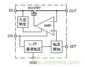 AAT4610將6V/2A的P溝道MOSFET場效應(yīng)管與柵極驅(qū)動器、電壓基準(zhǔn)、限流比較器和欠壓閉鎖電路組合在SOT-23-5封裝中(如圖2)。其中MOSFET是一個電子開關(guān),它的通斷受比較器輸出電壓的控制,如果輸出電流大于設(shè)定電流,運算放大器AMP輸出負(fù)電壓,關(guān)斷MOSFET,停止電壓輸出,對供電電路起到保護(hù)作用。MOSFET的溝道電阻最大值僅為180mΩ,關(guān)斷模式下靜態(tài)電流為1mA。MOSFET的工作電壓為2.7V~5.5V,輸入電壓低于2.7V時,由欠壓鎖定電路關(guān)斷MOSFET,對供電電路進(jìn)行欠壓保護(hù)。