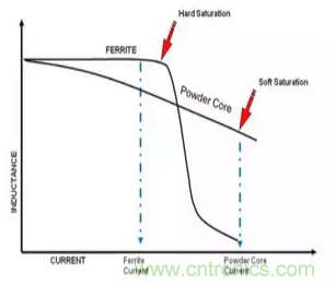 所以一般電感的電感值在0A電流的時(shí)候電感值最大,但是隨著電流增大電感值會慢慢下降,不同的磁芯材料,電感值的下降速度不一樣。當(dāng)電感值下降很快的時(shí)候,我們稱這個(gè)電感為Soft Saturation, 當(dāng)電感值開始下降很慢的時(shí)候,我們成為Stiff/Hard Saturation。不少電感值在飽和后,只有原電感值的1/3,甚至1/10。這點(diǎn)變化也是電路設(shè)計(jì)中需要重點(diǎn)考慮的。