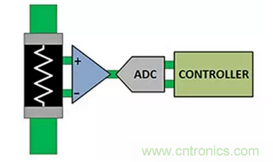 用于檢測電流的最常見傳感元件,是置于電流路徑中的低阻值精密電阻器。該電阻通常稱為分流器,會在兩端產(chǎn)生一個與通過它的電流成比例的電壓。由于分流電阻器不應(yīng)該顯著影響電流,所以它通常非常小,阻值為毫歐級或不到一毫歐 (mΩ)。分流電阻器兩端產(chǎn)生的電壓因此也非常小,在被ADC轉(zhuǎn)換之前通常需要放大。