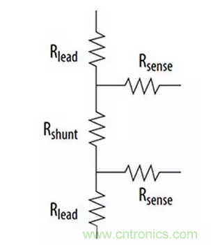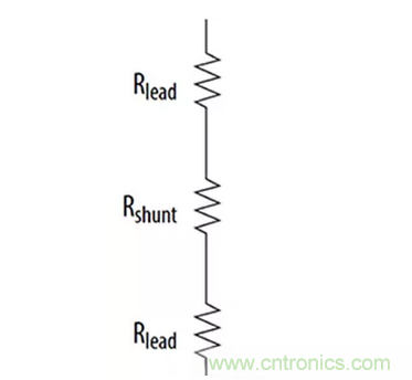 分流電阻器并不像其外表看起來那么簡單。具體而言,分流電阻器的電阻實際上由三個電阻組成(圖2)。首先,分流電阻器本身有電阻。其次,分流電阻器引線和分流電阻器連接的印刷電路板上的引線也有電阻。通常這些引線電阻不明顯,但是分流電阻器的電阻值通常非常低。在高電流測量中,即使很小的引線電阻也會引入測量誤差,因為制造商的分流電阻器電阻規(guī)格中并未考慮這些電阻。