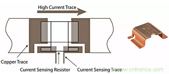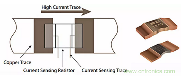 圖3:雙端電流檢測電阻器的開爾文連接可減少電阻器和電路板引線電阻引起的測量誤差。右側(cè)顯示的是雙端子分流電阻器實例圖像。(圖片來源:Bourns)
