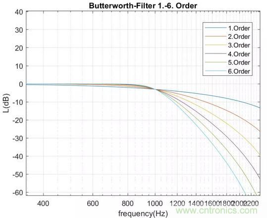 下圖為1階到6階截止頻率為1000Hz的Butterworth低通濾波器的幅值特性曲線