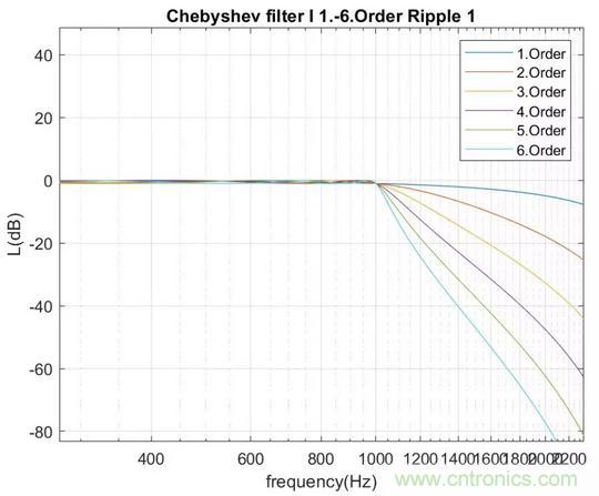 1到6階截止頻率為1000Hz的I型切比雪夫低通濾波器幅值特性如下圖