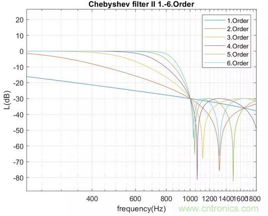 1到6階截止頻率為1000Hz的II型切比雪夫低通濾波器幅值特性如下圖