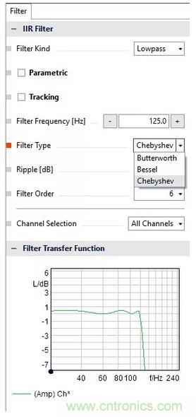 有三種IIR濾波器可供選擇,分別為切比雪夫I型、貝塞爾以及巴特沃斯濾波器。對于不同類型的濾波器可自定義參數(shù)。比如對于巴特沃斯濾波器需要定義截止頻率和濾波器階數(shù),如果是帶通或者帶阻,還需要確定通帶/阻帶帶寬;如果是切比雪夫?yàn)V波器的話,還需要確定波動值。