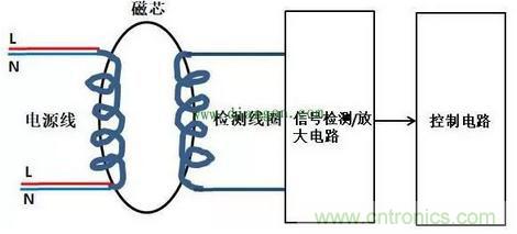 如圖1所示,漏電保護器正常工作時,因未漏電,故只有零線和火線有電流流動,即i1不存在,i0=i2,通過圖2分析得知,由于零線和火線電流大小相等,方向相反磁場相互抵消,故磁芯不生產耦合磁場,圖4的檢測線圈不生產感應電勢,控制電路不動作;當有漏電發(fā)送時,i1電流存在,火線電流i0=i1+i2,零線電流為i2,火線電流大于零線電流,不對稱,故磁芯有耦合磁場傳遞到檢測線圈那,檢測線圈產生感應電勢,導致控制電路動作切斷電源。