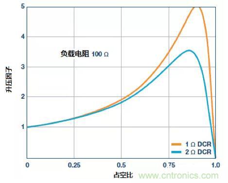 圖2中曲線的變化真實地顯示出輸出端負(fù)載電阻和電感的直流電阻的改變,對升壓因子造成的影響。假設(shè)負(fù)載電阻為100Ω,48V的輸出電壓,這對應(yīng)于負(fù)載電流480mA。當(dāng)電感的串聯(lián)電阻(DCR)只有2Ω,最大升壓因子是有可能剛好超過3; 但對于DCR為1Ω,略高于5的升壓因子是可以實現(xiàn)的。如要求更高的升壓因子,就必須選用具有更低的串聯(lián)電阻值的電感。