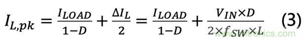 假設(shè)升壓轉(zhuǎn)換器在連續(xù)導(dǎo)通模式 ( Continuous Conduction Mode, CCM) 下工作,峰值電感電流可從公式(1)和(2)得出,具體計算如下: