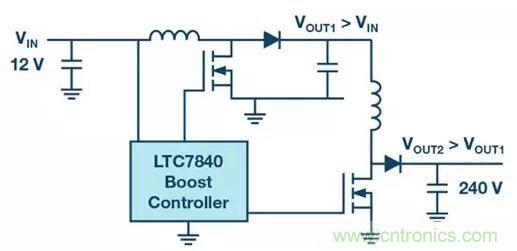 而另一個獲得較高升壓因子的方案就是使用多相 (Multi Output Phases)。以ADI公司的LTC7840芯片為例,當(dāng)中包含兩個升壓控制器。這使得實現(xiàn)兩相升壓概念變得容易。圖三顯示了電源電壓為12V的示例,輸出升壓至240V電壓。兩相升壓級將電壓分開增加,使得每級僅需要將電壓增加約4.5倍。