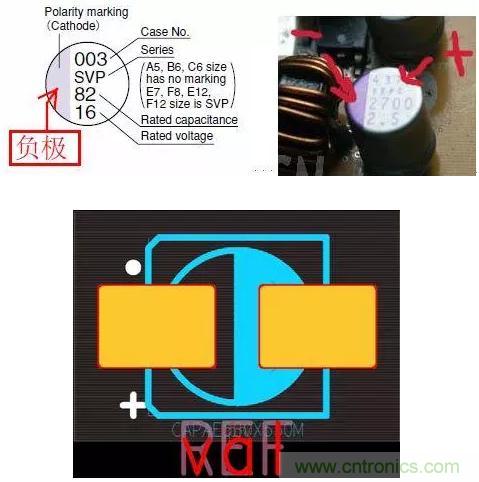 在PCB板上,白色標(biāo)志為負(fù),有+號(hào)的一端為正。其實(shí)啊,還是不要管什么標(biāo)示,誰(shuí)知道你有沒(méi)有畫(huà)錯(cuò)PCB,或封裝畫(huà)錯(cuò),老老實(shí)實(shí)回到電路上面去,正電源進(jìn)去和出來(lái)都接電容正極,電容負(fù)極接地。負(fù)電源輸入和輸出都接電容負(fù)極,電容正極接地。