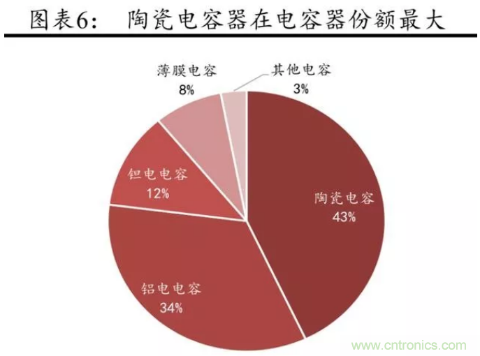 據(jù)中國(guó)產(chǎn)業(yè)信息網(wǎng) 2017年 5 月報(bào)道,陶瓷電容器在包括鋁電解電容 器、鉭電解電容器及薄膜電容器在內(nèi)的四類主要電容器中市場(chǎng)份額最高,達(dá)到約43%,是當(dāng)前生產(chǎn)規(guī)模最大、發(fā)展最快的片式元器件之一。