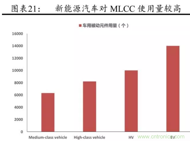 電動(dòng)汽車對(duì) MLCC 元件的需求量巨大,其中動(dòng)力系統(tǒng)帶來的MLCC增量較為顯著。據(jù)前瞻研究院的數(shù)據(jù),每輛汽車使用的電子元件,中端車平均為 6300 個(gè),高端車為 8200 個(gè),純電動(dòng)汽車增加到14000個(gè),其中有一半是 MLCC,這意味著隨著新能源汽車的不斷普及,MLCC 需求量會(huì)不斷增長(zhǎng)。