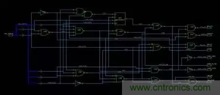 有了完整規(guī)畫后,接下來便是畫出平面的設(shè)計(jì)藍(lán)圖。在 IC 設(shè)計(jì)中,邏輯合成這個步驟便是將確定無誤的 HDL code,放入電子設(shè)計(jì)自動化工具(EDA tool),讓電腦將 HDL code 轉(zhuǎn)換成邏輯電路,產(chǎn)生如下的電路圖。之后,反覆的確定此邏輯閘設(shè)計(jì)圖是否符合規(guī)格并修改,直到功能正確為止。