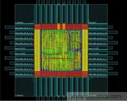 最后,將合成完的程式碼再放入另一套 EDA tool,進(jìn)行電路布局與繞線(Place And Route)。在經(jīng)過不斷的檢測后,便會形成如下的電路圖。圖中可以看到藍(lán)、紅、綠、黃等不同顏色,每種不同的顏色就代表著一張光罩。至于光罩究竟要如何運(yùn)用呢?