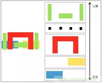 下圖中,左邊就是經(jīng)過電路布局與繞線后形成的電路圖,在前面已經(jīng)知道每種顏色便代表一張光罩。右邊則是將每張光罩?jǐn)傞_的樣子。制作是,便由底層開始,依循上一篇 IC 芯片的制造中所提的方法,逐層制作,最后便會產(chǎn)生期望的芯片了。