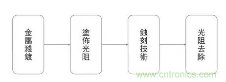 金屬濺鍍:將欲使用的金屬材料均勻?yàn)⒃诰A片上,形成一薄膜。