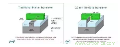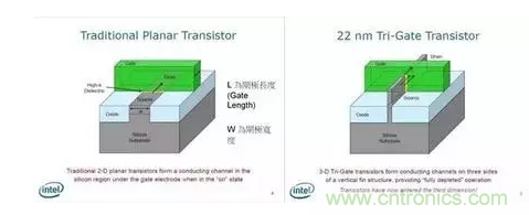 不過,制程并不能無限制的縮小,當(dāng)我們將電晶體縮小到 20 納米左右時,就會遇到量子物理中的問題,讓電晶體有漏電的現(xiàn)象,抵銷縮小 L 時獲得的效益。作為改善方式,就是導(dǎo)入 FinFET(Tri-Gate)這個概念,如右上圖。在 Intel 以前所做的解釋中,可以知道藉由導(dǎo)入這個技術(shù),能減少因物理現(xiàn)象所導(dǎo)致的漏電現(xiàn)象。