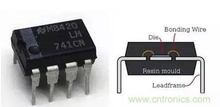 ▲ 左圖的 IC 芯片為 OP741,是常見的電壓放大器。右圖為它的剖面圖,這個封裝是以金線將芯片接到金屬接腳(Leadframe)。(Source :左圖 Wikipedia、右圖 Wikipedia)