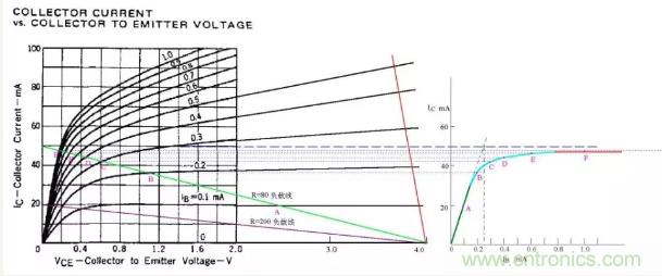 圖中假定電源電壓為4V,綠色的斜線是負(fù)載電阻為80歐姆的負(fù)載線,V/R=50MA,圖中標(biāo)出了Ib分別等于0.1、0.2、0.3、0.4、0.6、1.0mA的工作點A、B、C、D、E、F。據(jù)此在右側(cè)作出了Ic與Ib的關(guān)系曲線。根據(jù)這個曲線,就比較清楚地看出“飽和”的含義了。曲線的綠色段是線性放大區(qū),Ic隨Ib的增大幾乎成線性地快速上升,可以看出β值約為200。蘭色段開始變彎曲,斜率逐漸變小。紅色段就幾乎變成水平了,這就是“飽和”。實際上,飽和是一個漸變的過程,蘭色段也可以認(rèn)為是初始進入飽和的區(qū)段。在實際工作中,常用Ib*β=V/R作為判斷臨界飽和的條件。在圖中就是假想綠色段繼續(xù)向上延伸,與Ic=50MA的水平線相交,交點對應(yīng)的Ib值就是臨界飽和的Ib值。圖中可見該值約為0.25mA。