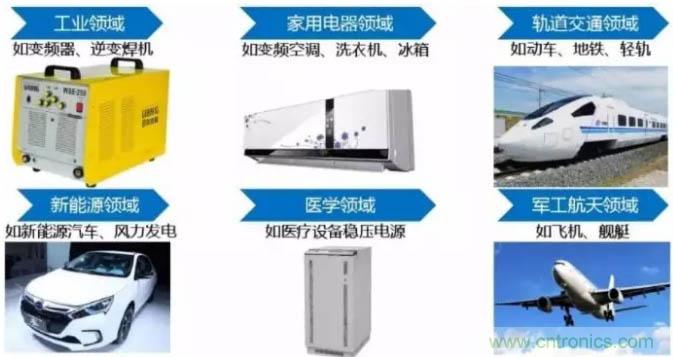 作為新型功率半導體器件的主流器件,IGBT已廣泛應用于工業(yè)、 4C(通信、計算機、消費電子、汽車電子)、航空航天、國防軍工等傳統(tǒng)產(chǎn)業(yè)領域,以及軌道交通、新能源、智能電網(wǎng)、新能源汽車等戰(zhàn)略性新興產(chǎn)業(yè)領域。