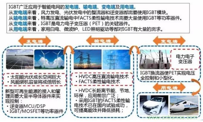 IGBT廣泛應用于智能電網(wǎng)的發(fā)電端、輸電端、變電端及用電端:
