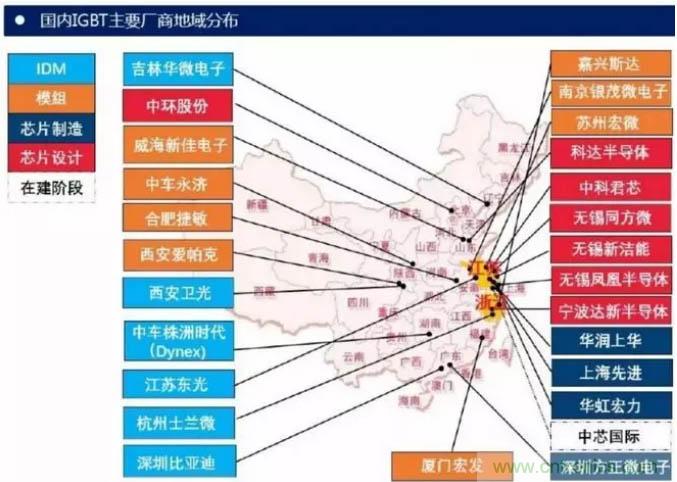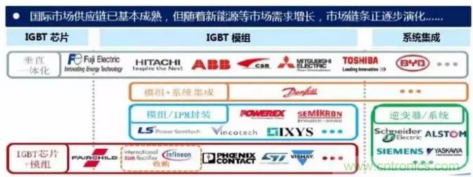 從公司來看,國外研發(fā)IGBT器件的公司主要有英飛凌、 ABB、三菱、西門康、東芝、富士等。中國功率半導體市場占世界市場的50%以上,但在中高端MOSFET及IGBT主流器件市場上,90%主要依賴進口,基本被國外歐美、日本企業(yè)壟斷。