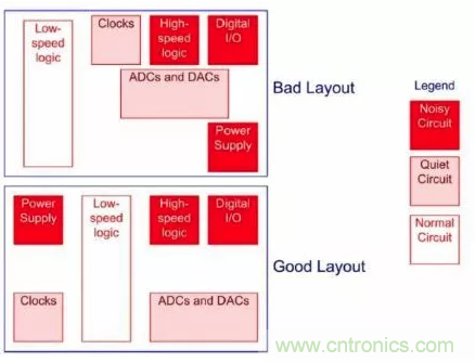 第一個(gè)布局中放置時(shí)鐘和數(shù)據(jù)轉(zhuǎn)換器在相鄰于噪聲器件的附近。噪聲將會(huì)耦合到敏感電路及降低他們的性能。第二個(gè)布局做了有效的電路隔離將有利于系統(tǒng)設(shè)計(jì)的信號(hào)完整性。